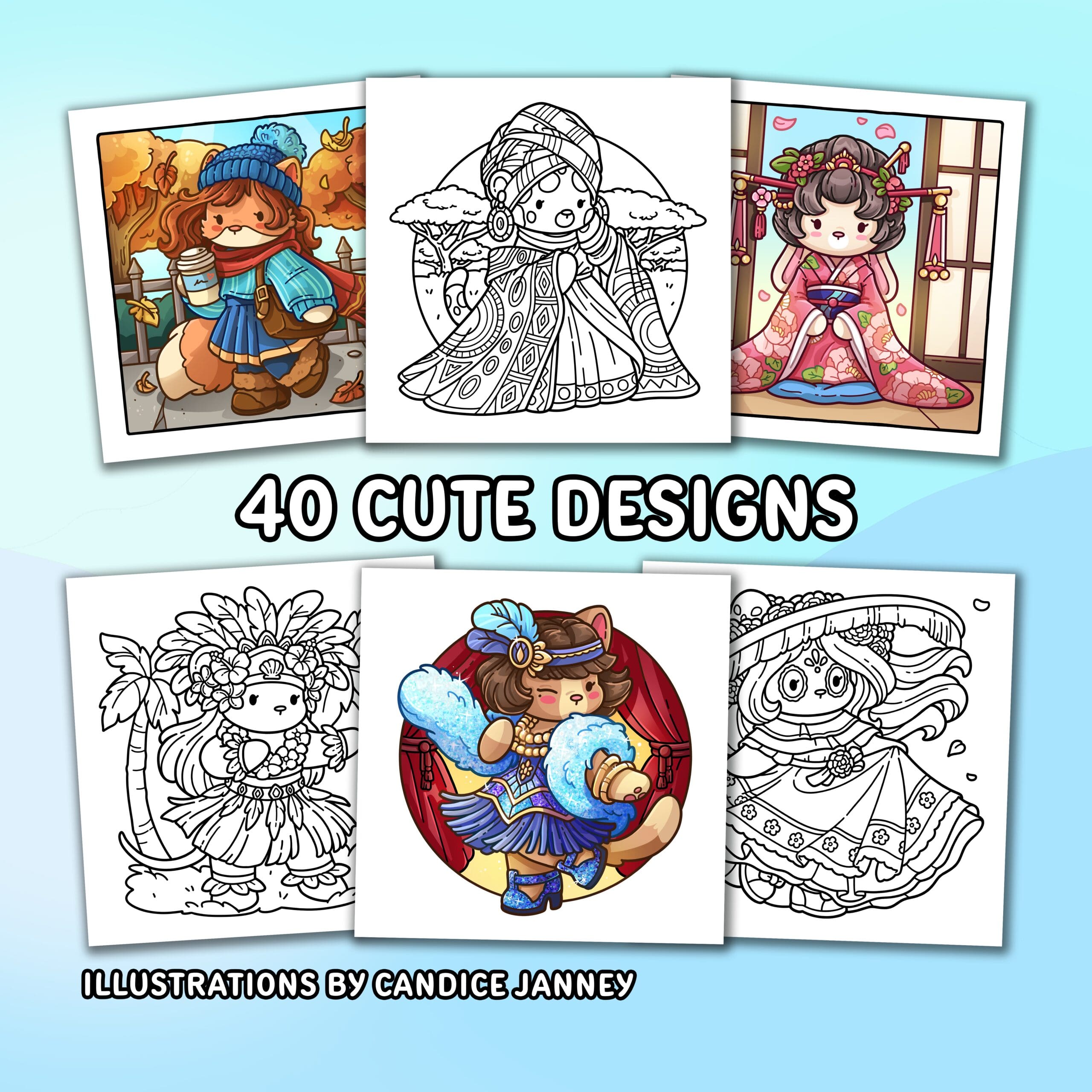 - 40 Cute Images. Adorable designs printed on 8.5” x 8.5” pages.